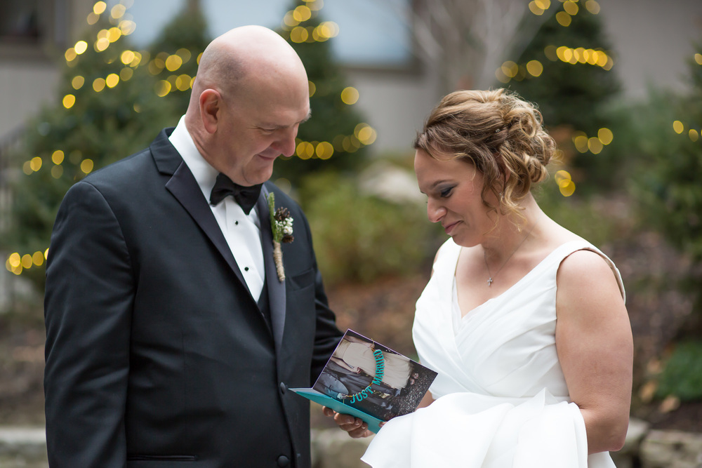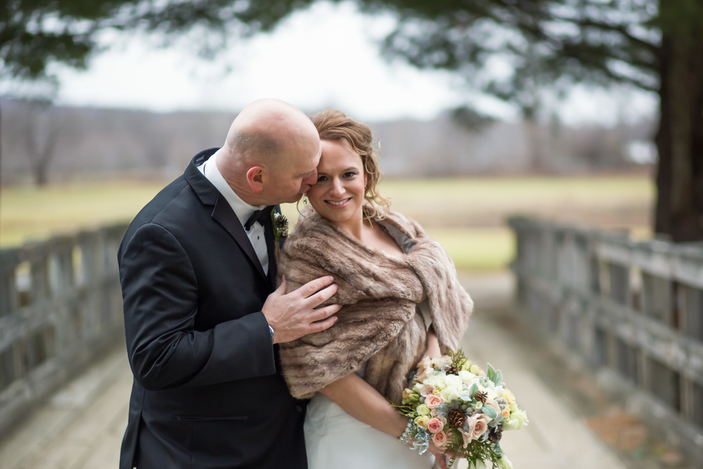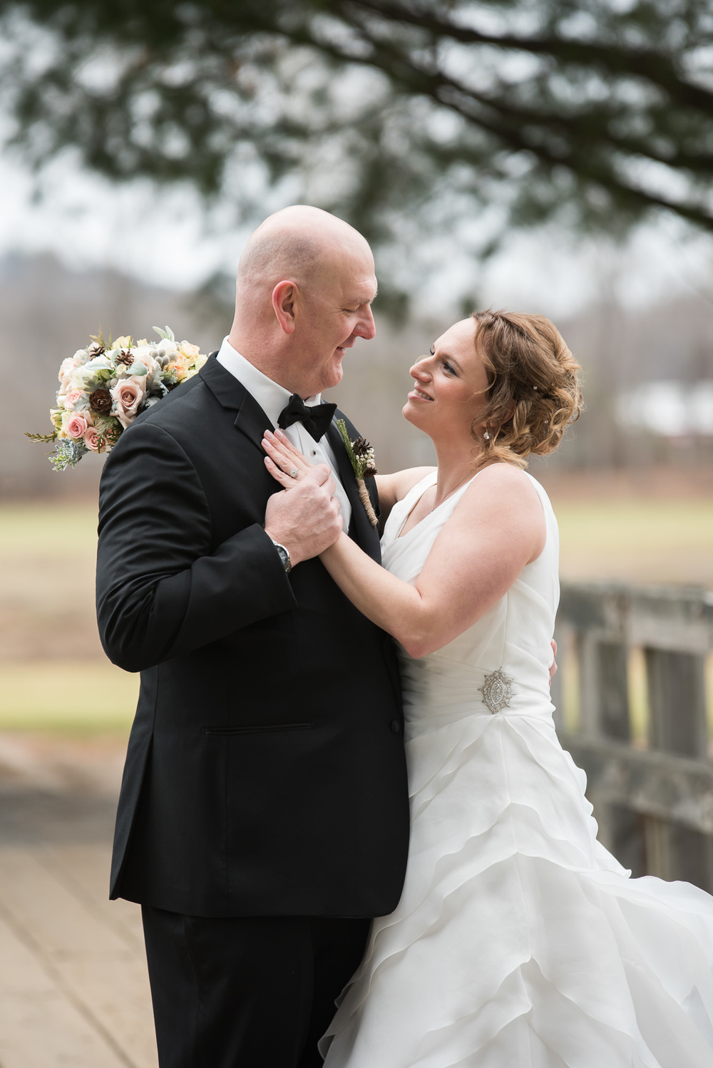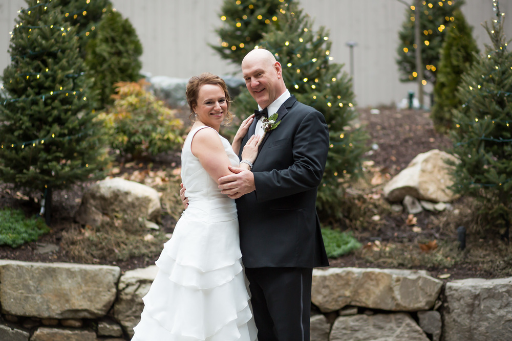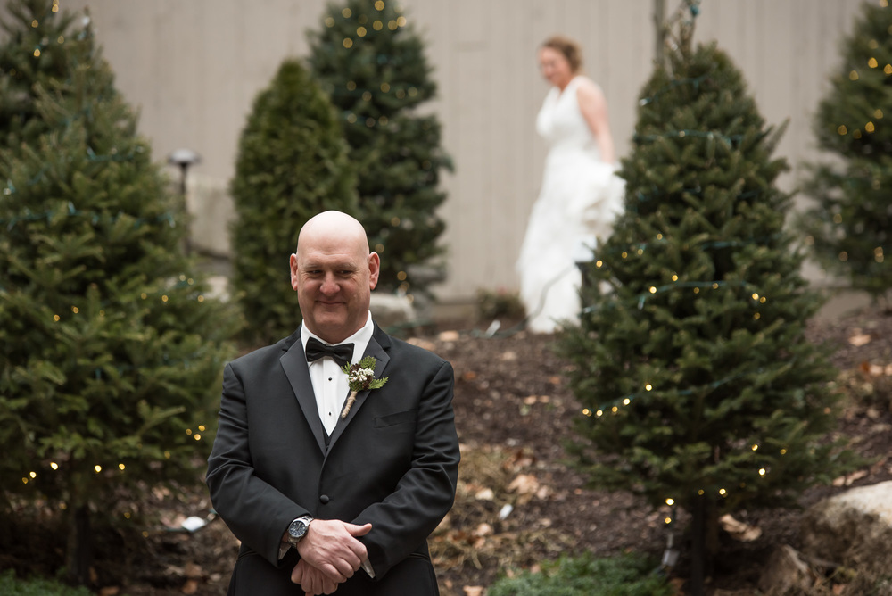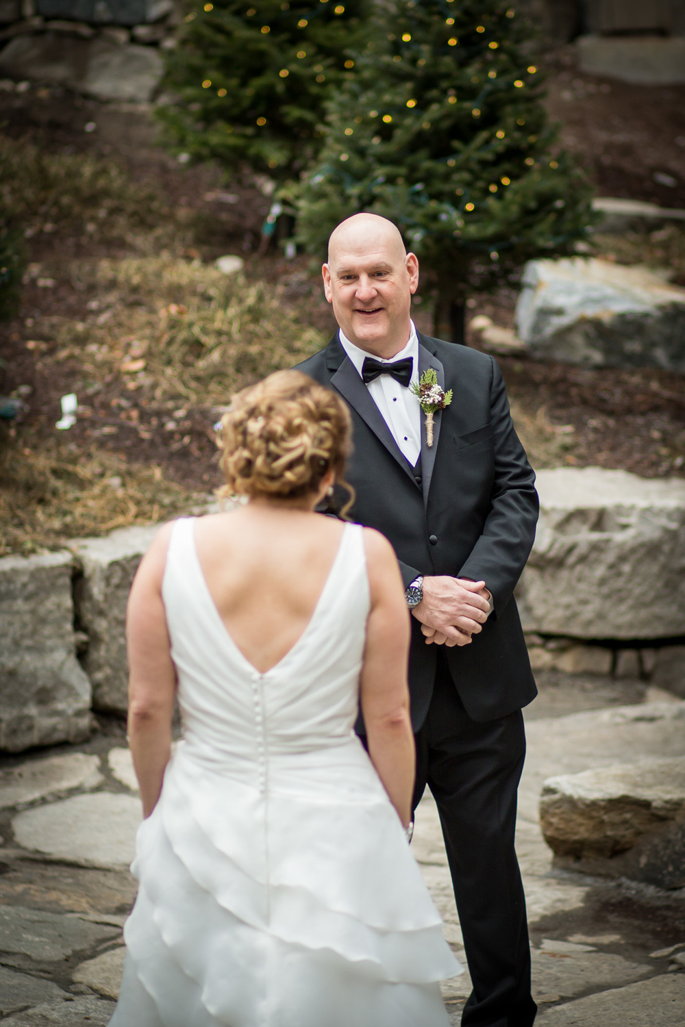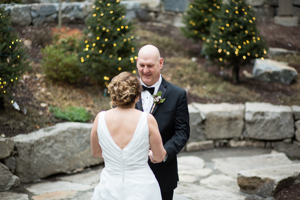 I do love winter weddings, and if you love photos as much as Deana and I, you can do a “first look” that offers you more time for photos of you two before the sun goes down. A “first look” is where I photograph the groom seeing his bride for the first time that day. Usually it’s in a neat, more private location, such as this stone garden area nestled in the Heritage Hotel complex.